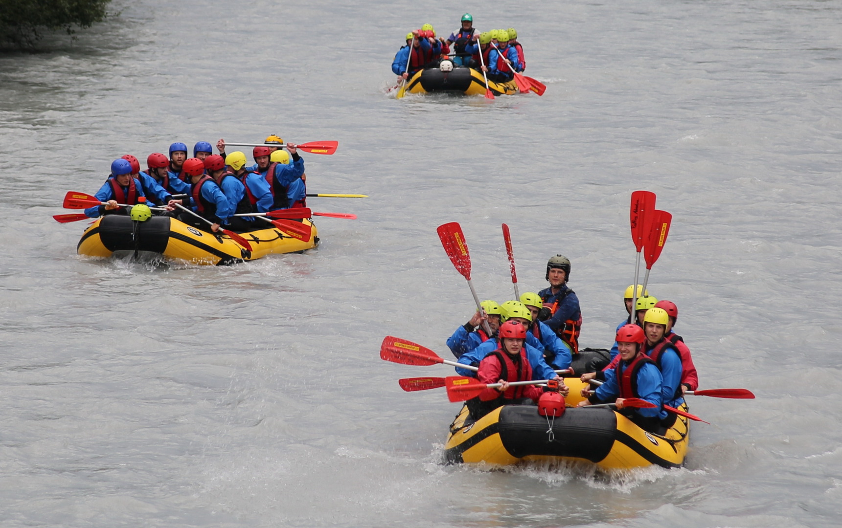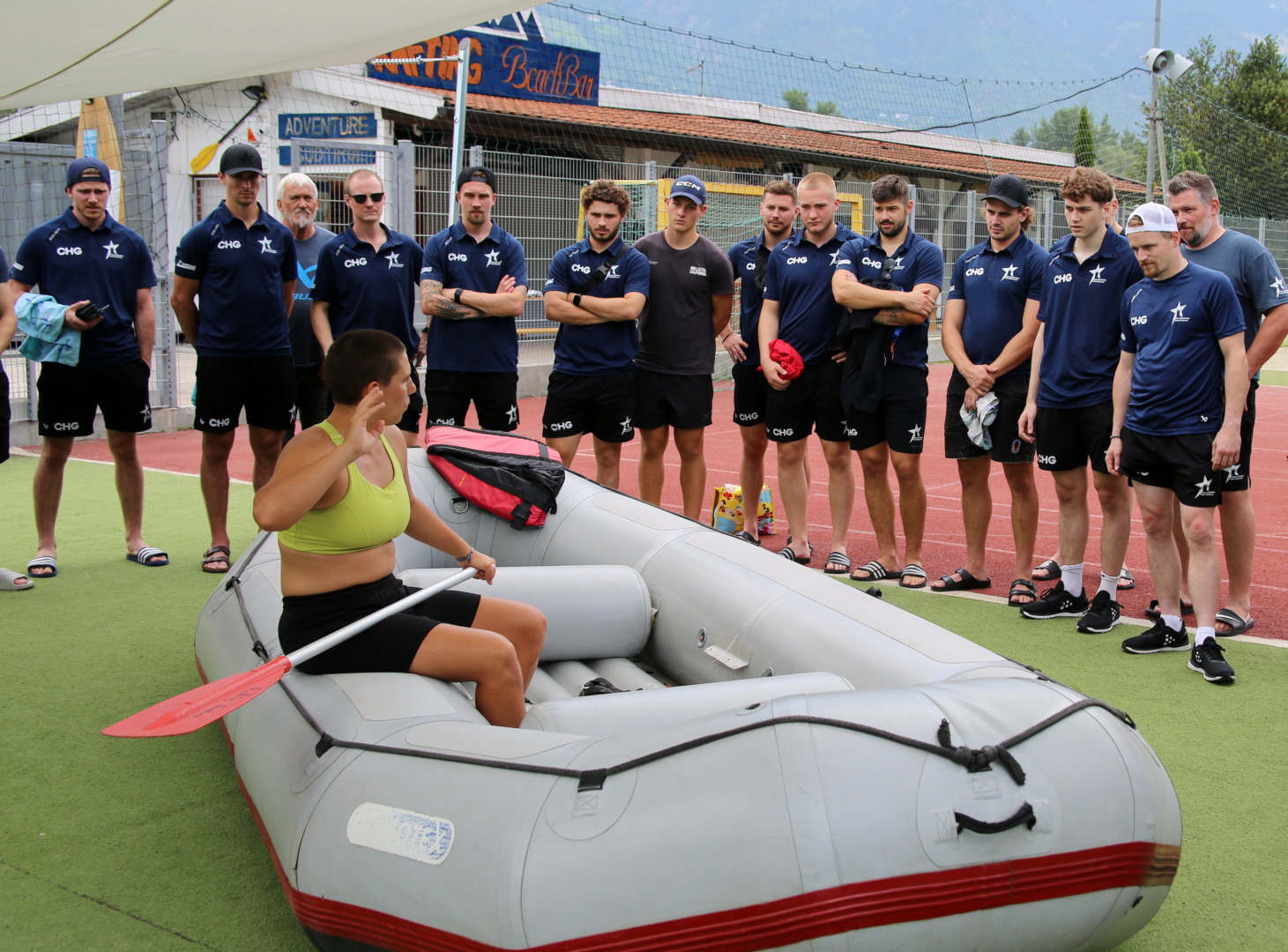 Eine willkommene und nicht zuletzt kühlende Abwechslung stand für die Towerstars am Dienstagnachmittag auf dem Programm. Im Rahmen des wichtigen Teambuildings stand eine Rafting-Tour auf dem prägenden Fluss durch das Vinschgau, die Etsch, auf dem Programm. Hierzu ging es eine halbe Stunde in Richtung Meran, konkret nach Rabland. Bei Rafting Adventure Südtirol hatten die Towerstars drei Boote gebucht und bekamen hier Abenteuer satt. Nach der Ausgabe der Neoprenanzüge, Helme und Schwimmwesten gab es zunächst eine obligatorische Einweisung durch Rafting-Guide „Charlie“. Hier wurden nicht nur die Sicherheitshinweise abgearbeitet, sondern auch die Ruderarbeit an Bord erklärt. Dann ging es auch schon los. Zunächst fuhren sie rund 25 Minuten stromaufwärts, dort wurden die drei Boote dann in die Etsch gelassen. Die anschließende Fahrt war teils anspruchsvoll und erforderte absolute Teamarbeit. Dort, wo das Wasser nicht ganz so rau war, wurden von den Towerstars-Cracks durch die Guides auch mal besondere Aufgaben eingefordert. Dank des Neoprenanzugs war der mehr oder weniger freiwillige Sprung ins kalte Wasser nicht ganz so unangenehm.