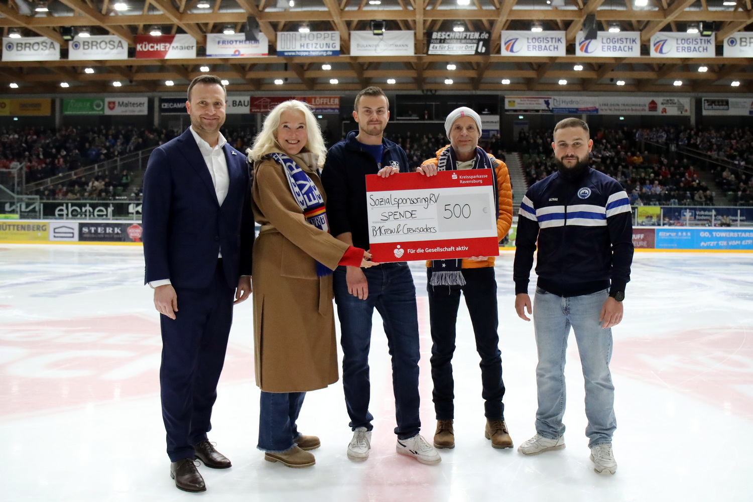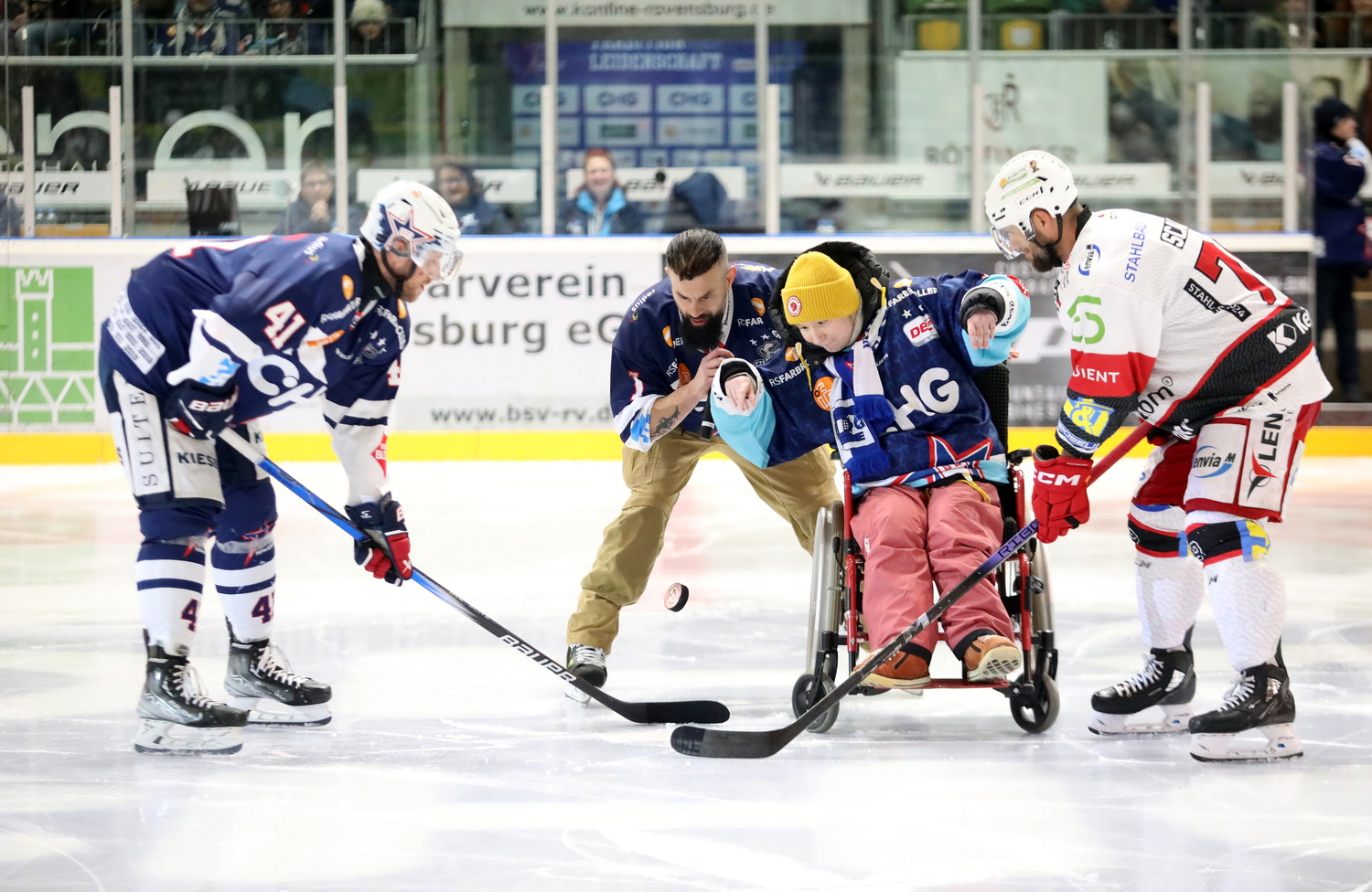 Um auf das wichtige Thema „Barrierefreiheit im Alltag“ hinzuweisen, lief kurz vor dem Einlauf beider Teams ein satirisch aufgebauter Beitrag, der so manchem Zuschauer auf den Rängen eventuell ins Gewissen geredet haben dürfte. Nach der Vorstellung der Starting 6 durfte Rollstuhlfahrerin Tabea stellvertretend für ihre Kolleginnen und Kollegen das Anspielbully einwerfen. Vor rund 2600 Zuschauern mit den Mittelstürmern beider Teams und der Schiedsrichter auf dem Eis zu stehen, war natürlich ein ganz besonderes Highlight. Zuvor hatte die Fangruppen B1-Crew und Crewsaders einen Scheck über 500 Euro an das Unterstützungsnetzwerk „Sozialsponsoring Ravensburg e.V.“ übergeben.