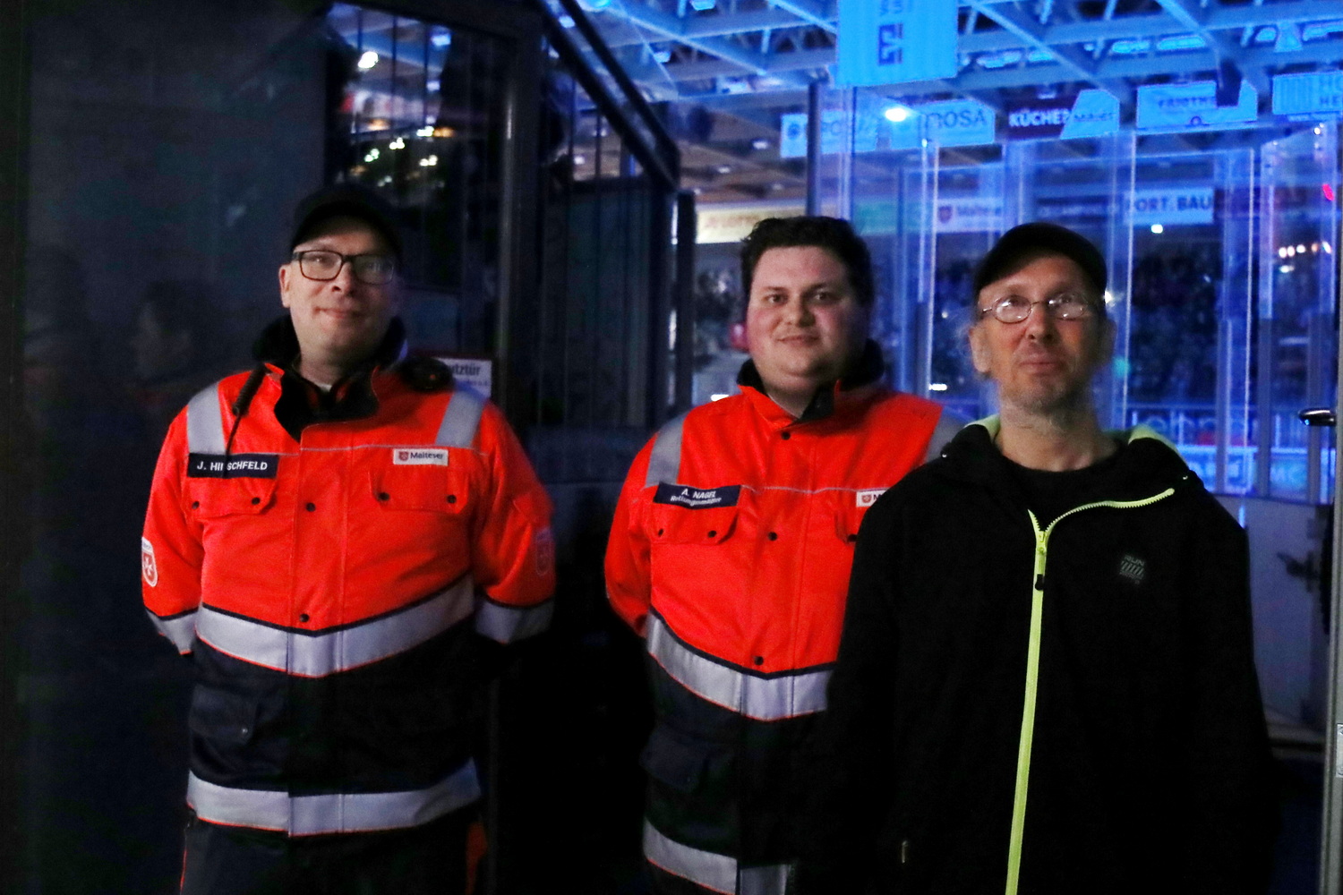 Für die Gäste-Gruppe begann der Abend schon lange vor Spielbeginn. Bei einer Pre-Game-Besprechung wurden zunächst die Aufgaben verteilt, denn es gab viel Arbeit. Beispielsweise bekamen die Towerstars-Betreuer Unterstützung beim Vorbereiten der Spielerbank. Auch am Fanstand freute man sich über die helfenden Hände. Währenddessen bekamen die Helfer für die Straf- und Zeitnehmerbank sowie die SpradeTV-Produktion einen Einblick in die Tätigkeiten des Abends. Das war freilich vor dem Hintergrund sehr interessant, da in diesen Bereichen ein normaler Zuschauer keine Einblicke hat. Selbstverständlich gab es ausreichend Gelegenheit, auch individuelle Fragen zu stellen. 30 Minuten vor Spielbeginn wurde es dann zum ersten Mal richtig spannend, als die Gruppe beim Eröffnungsinterview des Livestreams von SpradeTV zu Gast war.