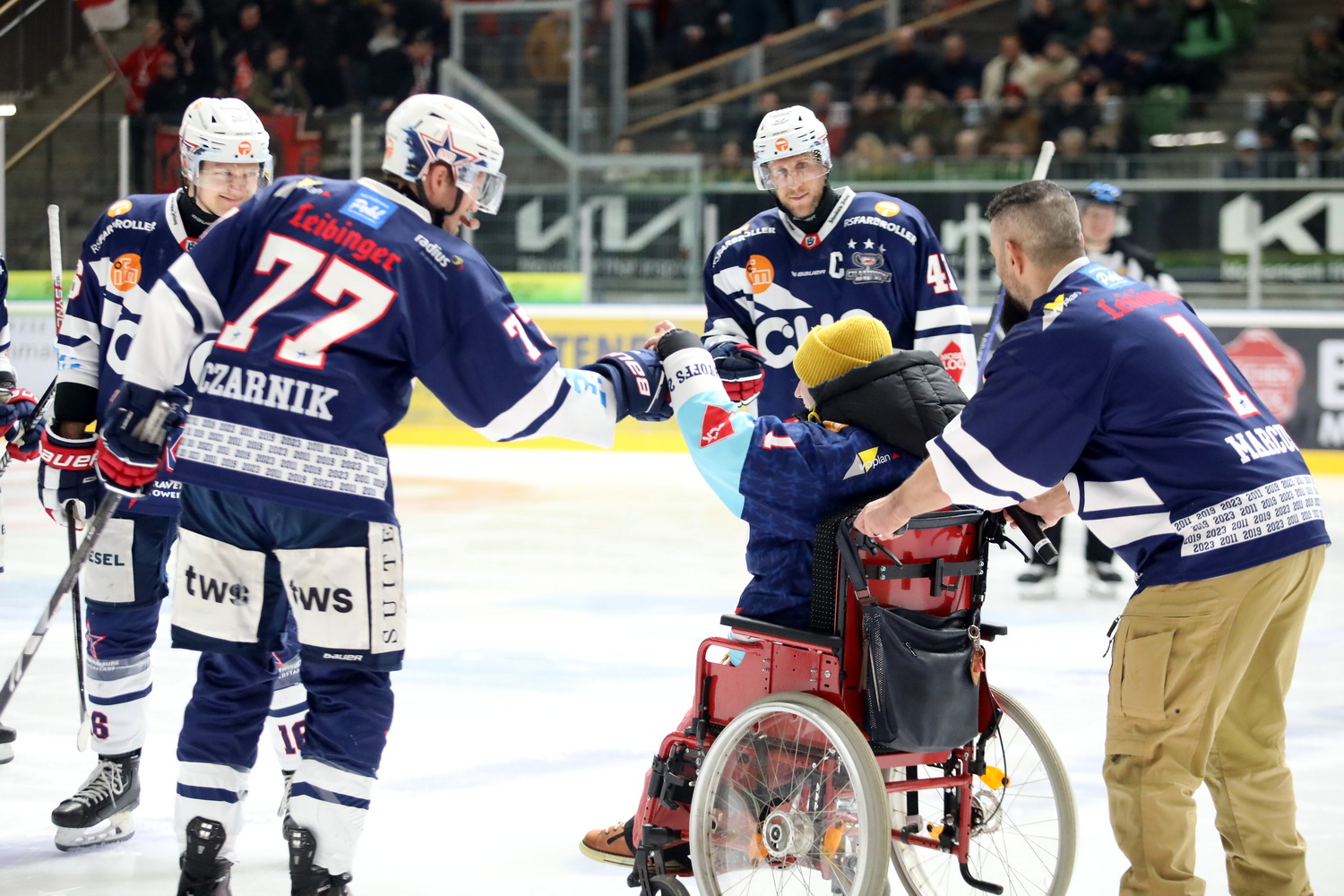 Um auf das wichtige Thema „Barrierefreiheit im Alltag“ hinzuweisen, lief kurz vor dem Einlauf beider Teams ein satirisch aufgebauter Beitrag, der so manchem Zuschauer auf den Rängen eventuell ins Gewissen geredet haben dürfte. Nach der Vorstellung der Starting 6 durfte Rollstuhlfahrerin Tabea stellvertretend für ihre Kolleginnen und Kollegen das Anspielbully einwerfen. Vor rund 2600 Zuschauern mit den Mittelstürmern beider Teams und der Schiedsrichter auf dem Eis zu stehen, war natürlich ein ganz besonderes Highlight. Zuvor hatte die Fangruppen B1-Crew und Crewsaders einen Scheck über 500 Euro an das Unterstützungsnetzwerk „Sozialsponsoring Ravensburg e.V.“ übergeben.
