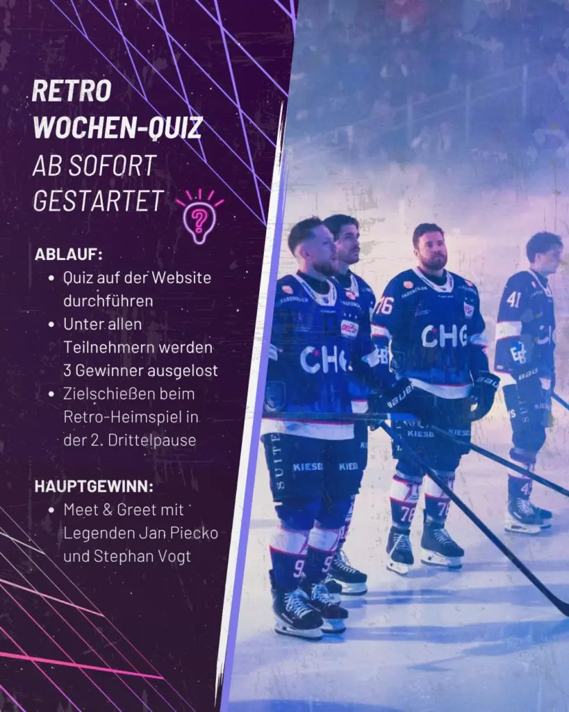 Und last but not least: das Retro-Wochenquiz inklusive Zielschießen in der 2. Drittelpause. Zu gewinnen gibt es ein Meet & Greet mit Jan Piecko und Stephan Vogt im Wirtshaus Mohren Ravensburg. Hier geht es zur Quiz-Teilnahme