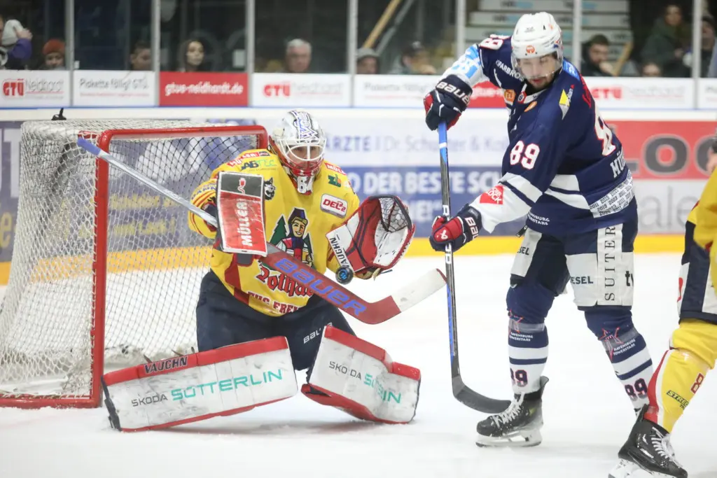 Es war klar, dass die Towerstars im Schlussabschnitt eine deutliche Leistungssteigerung und ein schnelles Anschlusstor benötigen würden. Das gelang prompt – mitunter auch, weil Freiburg mit der Schlusssirene des zweiten Drittels noch eine Strafzeit kassierte. Fabian Dietz lenkte nur 55 Sekunden nach dem Wiederanspiel einen klugen Pass an den Torraum zum 3:4 ins Freiburger Tor. Noch blieb genügend Zeit, das zähe Spiel wieder zurechtzubiegen. Matt Alfaro hatte wenig später bei einem Alleingang den Ausgleich vor Augen, doch wie schon viele seiner Kollegen zuvor und leider auch danach biss er sich die Zähne am Freiburger Torhüter Patrik Cerveny aus. Nicht nutzen konnten die Oberschwaben auch eine weitere EHCF-Strafzeit 75 Sekunden vor Ende, da half auch ein sechster Feldspieler nicht weiter. Freiburg stand, mit den wichtigen drei Punkten vor Augen, zu kompakt und konsequent in der eigenen Zone.