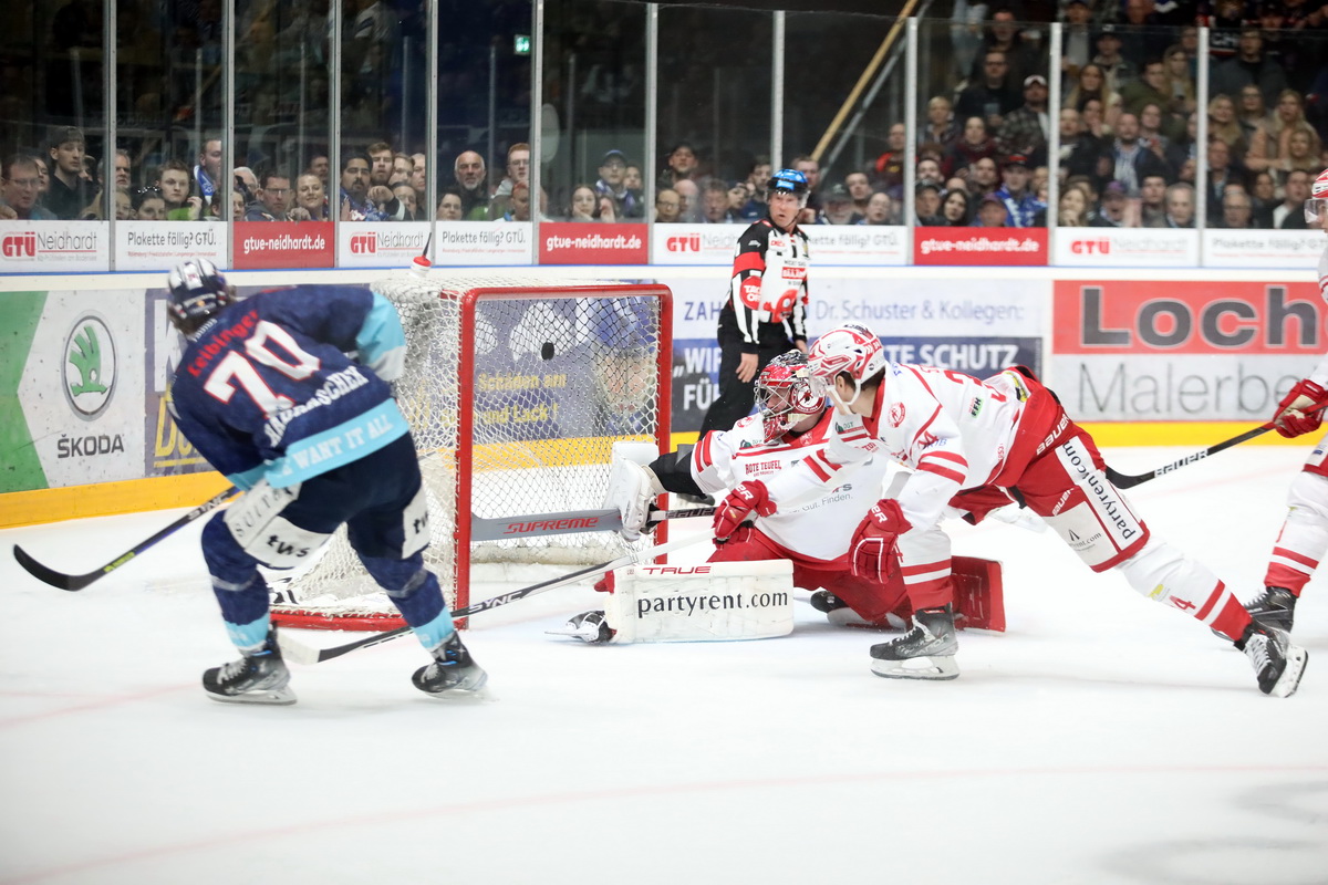 Im zweiten Abschnitt standen die Defensivabteilungen beider Mannschaften deutlich stabiler und kompakter, es musste wesentlich härter für Torchancen gearbeitet werden. Dass in solchen Situationen schon kleine individuelle Fehler Folgen haben können, zeigte sich in der 27. Minute. Die Roten Teufel waren weit ins Ravensburger Drittel aufgerückt, doch die Scheibe wurde von Charlie Sarault aus dem Drittel gespielt, an der Bande auf Höhe der Mittellinie von Nick Latta sofort weitergeleitet und dann war der Weg frei für Sam Herr. Dieser zog leicht nach rechts und vernaschte Felix Bick dann kompromisslos zum 4:2.