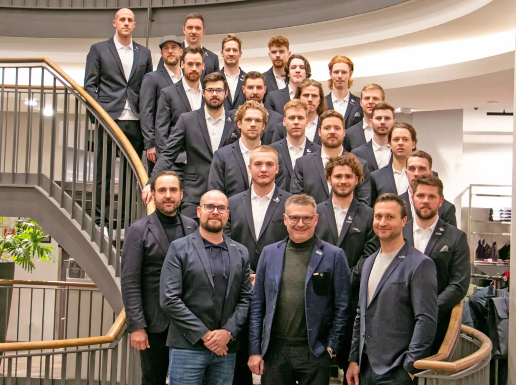 Auf dem Eis stehen die Towerstars in Ausrüstung und Trikot im sportlichen Blickpunkt, doch auch auf dem Weg zu den Spielen oder bei offiziellen Terminen gehört ein professionelles Erscheinungsbild einfach dazu. Dank unseres Pool-Partners Reischmann Fashion + Sport sind die Towerstars künftig bestens ausgestattet. Bei der Einkleidung in der vergangenen Woche erhielt das Team modische Anzüge von Zuitable, darunter tragen die Spieler Polo-Shirts der Marke Ragman.