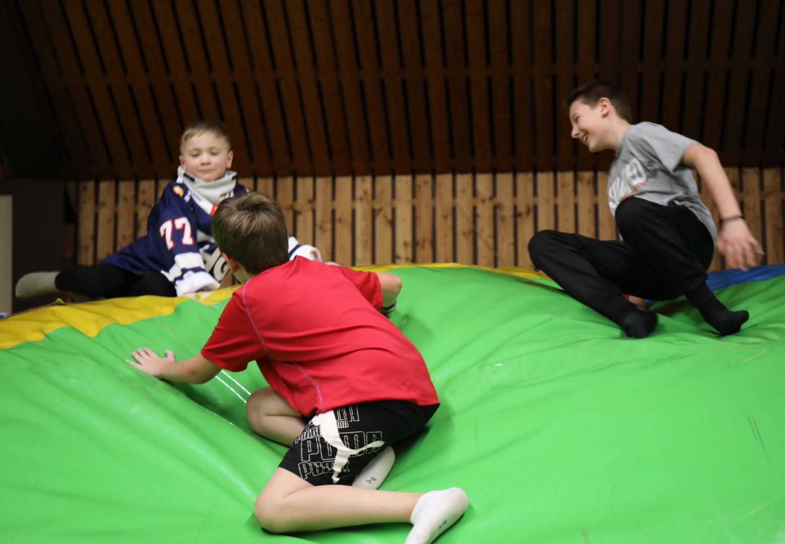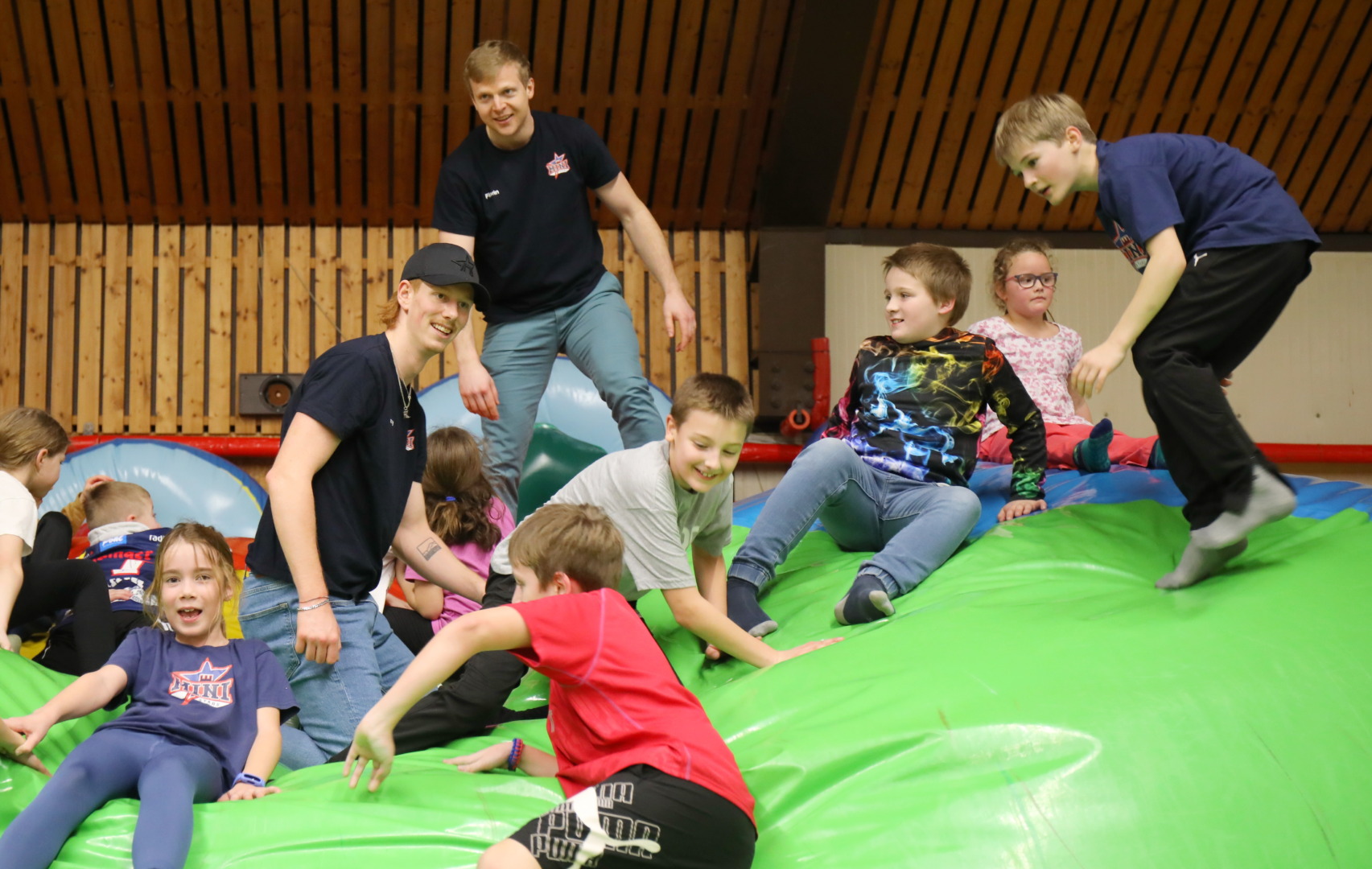 Nach einer kurzen Begrüßung ging es für die 40 angemeldeten Kids und die Spielerpaten Florin Ketterer, Oliver Granz und Tim Sezemsky auch gleich los. Die Schuhe ausgezogen und rein in den Spaß! Es wurde ausgiebig geklettert, gehüpft und gerutscht, zwischendurch gab es auch ausreichend Gelegenheit für die Mini Stars bei einer Runde Tisch-Kicker oder einem Dreirad-Parcours die Eishockeyprofis herauszufordern.