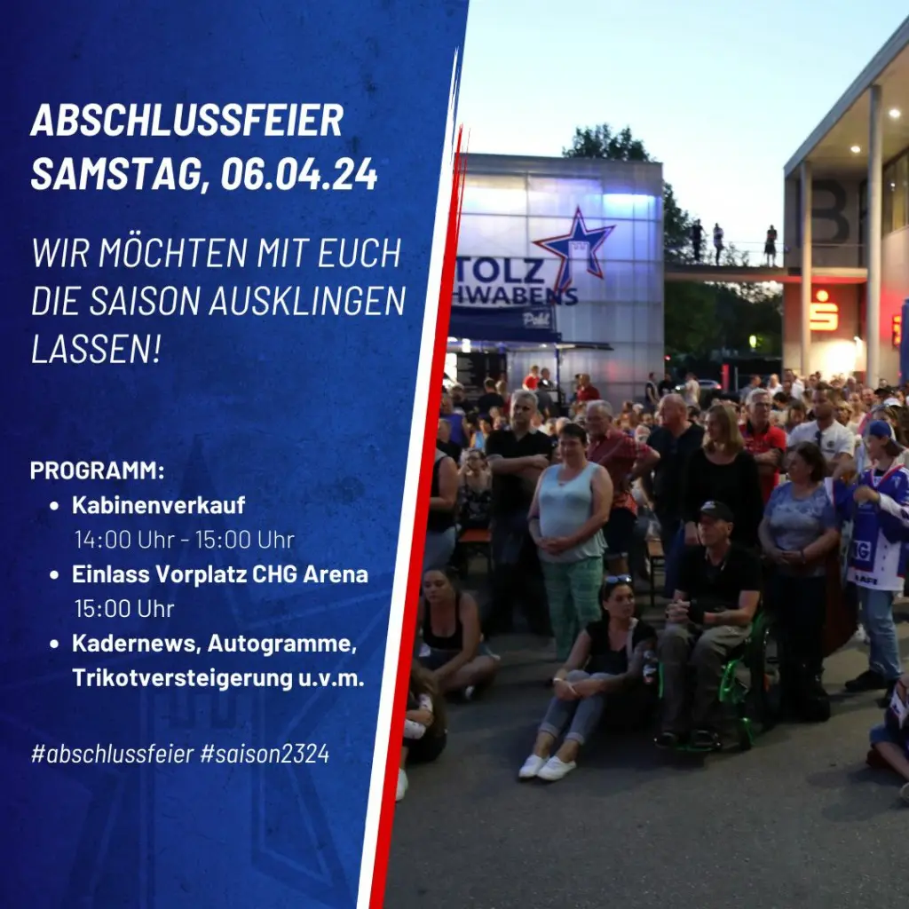 Mit einem Event auf dem Vorplatz der CHG Arena schließen die Ravensburg Towerstars die Saison 2023/2024 am Samstag, 06. April, nun auch formell ab. Neben dem letzten Auftritt des Teams gibt es auf der Bühne ein interessantes Programm mit personellen News, Verabschiedungen und Informationen zur neuen Saison. Nicht fehlen darf auch die Versteigerung der „Game worn“ Spielertrikots.
