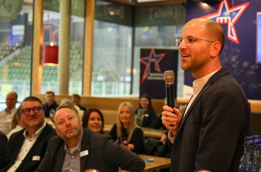 Nach den Grußworten von Dr. Patrick Kuchelmeister, Vorstandssprecher Wifo, sowie des Towerstars Aufsichtsrats und den Wifo-Geschäftsführern Eugen Müller und Clemens Stadler gab Towerstars Geschäftsführer Raphael Kapzan unter anderem einen Überblick über die Struktur der Ravensburg Towerstars und die Möglichkeiten, wie sich regionale Unternehmen als Sponsor und Partner einbringen können und gleichzeitig auch von einer Partnerschaft profitieren können.